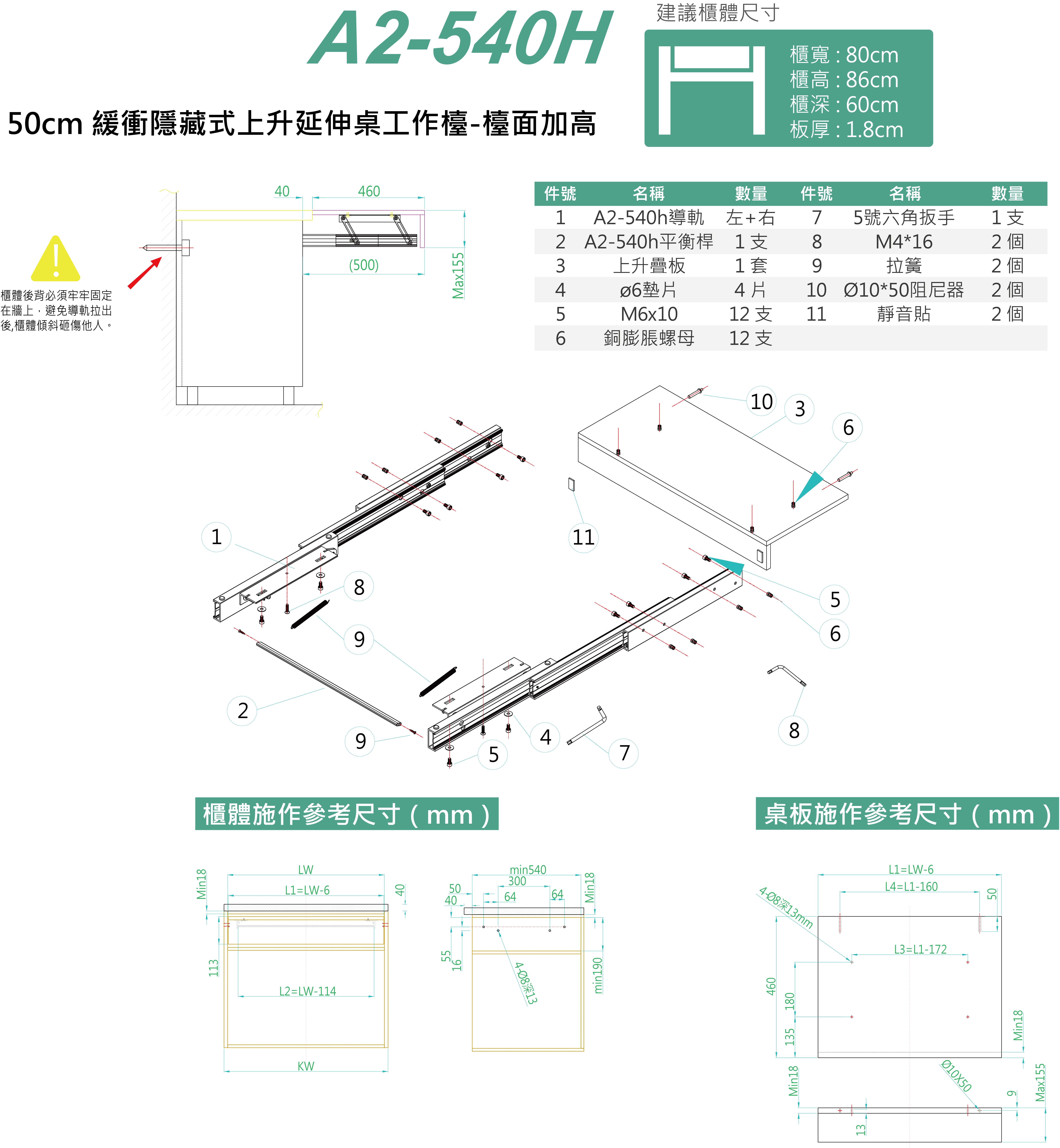 •櫃體最小內部深度:540mm